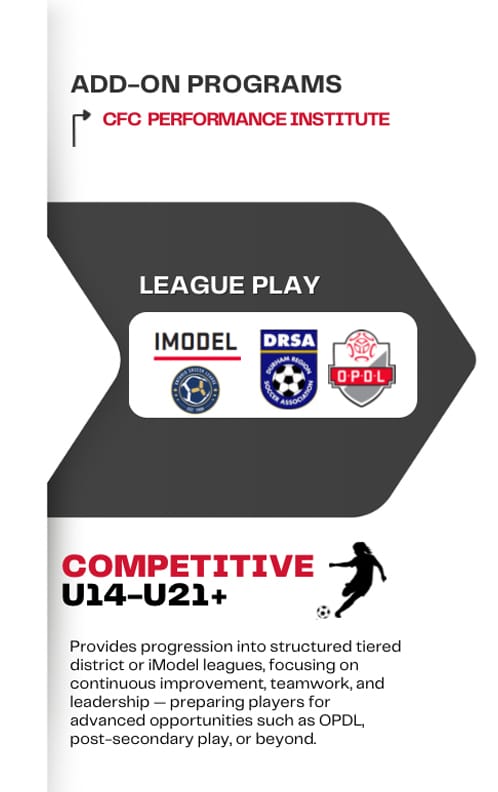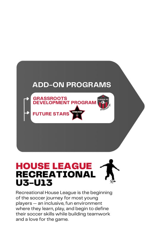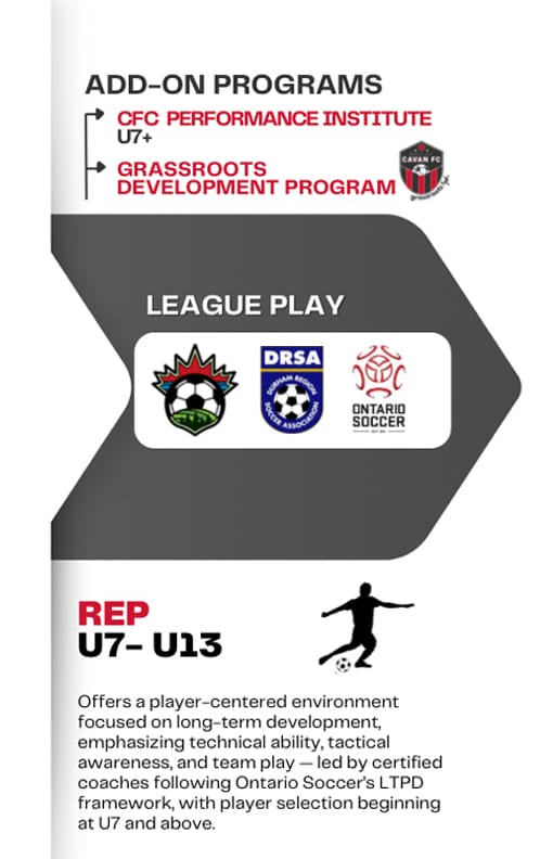 House League / Recreational → Development Programs → Rep / Competitive → High-Performance / Provincial Opportunities -- we offer optional add-on programs- Grassroots Development Program, Future Stars and Cavan FC Performance Institute so players and families can choose the level of commitment that fits their goals and lifestyle.